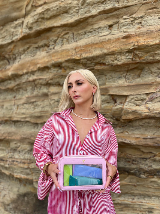 Absolutely love my cosmetic bag, it’s my little life-safer when traveling. It’s a great size to pack my lip balms, hand sanitizer, moisturizers and other essentials when flying. I love that I can see what’s in there and it also looks super chic. Such a great gift idea too.