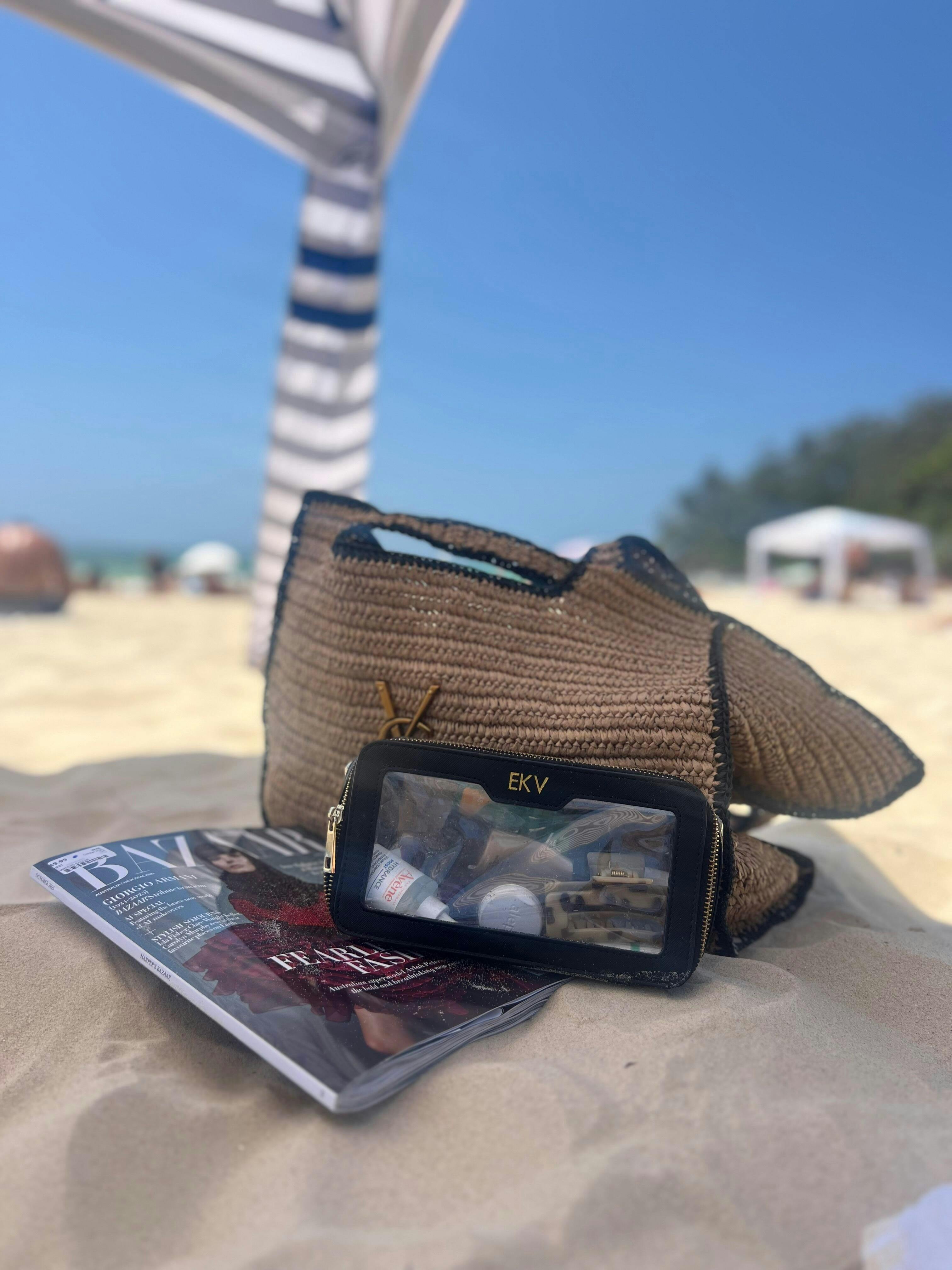 Our personalised double sided saffiano cosmetic bags are a luxe way to store your cosmetics. They are practical because one of the layers includes room for your make up brushes. Perfect for a weekend away or keeping in your handbag or car for touch ups. Your initials will be embossed in gold foil. These clear cosmetic bags measure approx 21.5 x 11.5 x 8cm.
